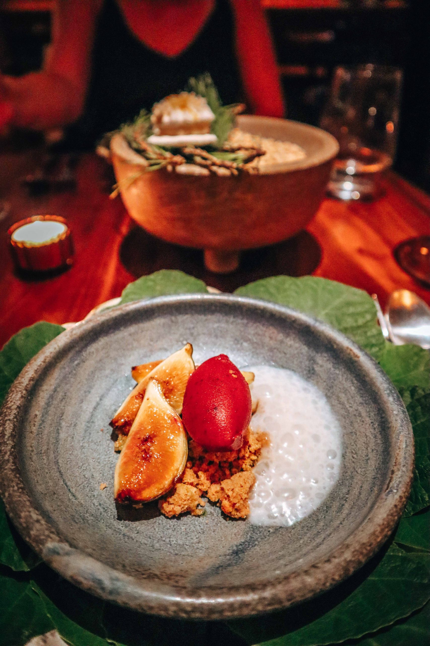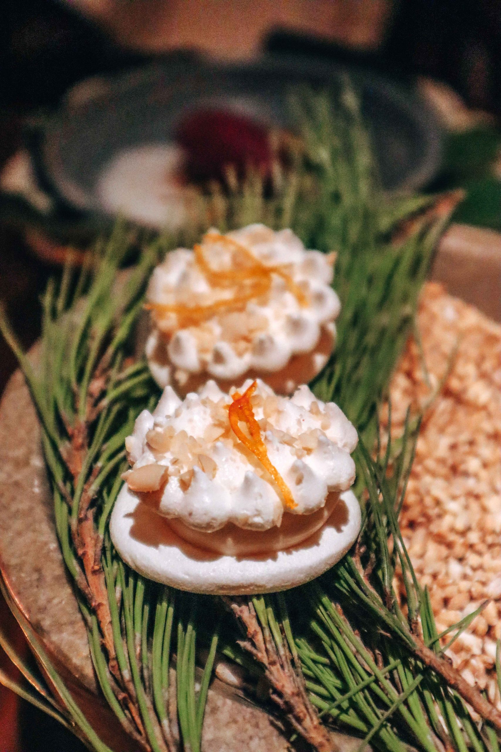 We are treated to a 12-course vegetarian “tasting menu.” The first course of small dishes is an instant hit. The absolute highlight is the imitation of a salted peanut with paprika and lime leaf. Next to it is a radiant, golden egg with soft hummus. We are also surprised by a fresh ceviche on a crispy base.